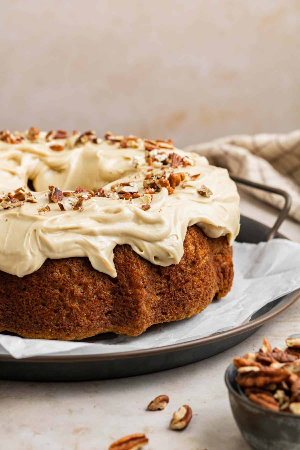 I know carrot cake is often thought of as a spring dessert, especially around Easter, but I always find myself craving it in the fall. With all those warm, cozy spices baked right in, it feels just as perfect for crisp autumn days. My version keeps things simple: a moist one-layer bundt cake topped with a rich brown sugar cream cheese frosting that is adapted from my Chai Cake recipe.