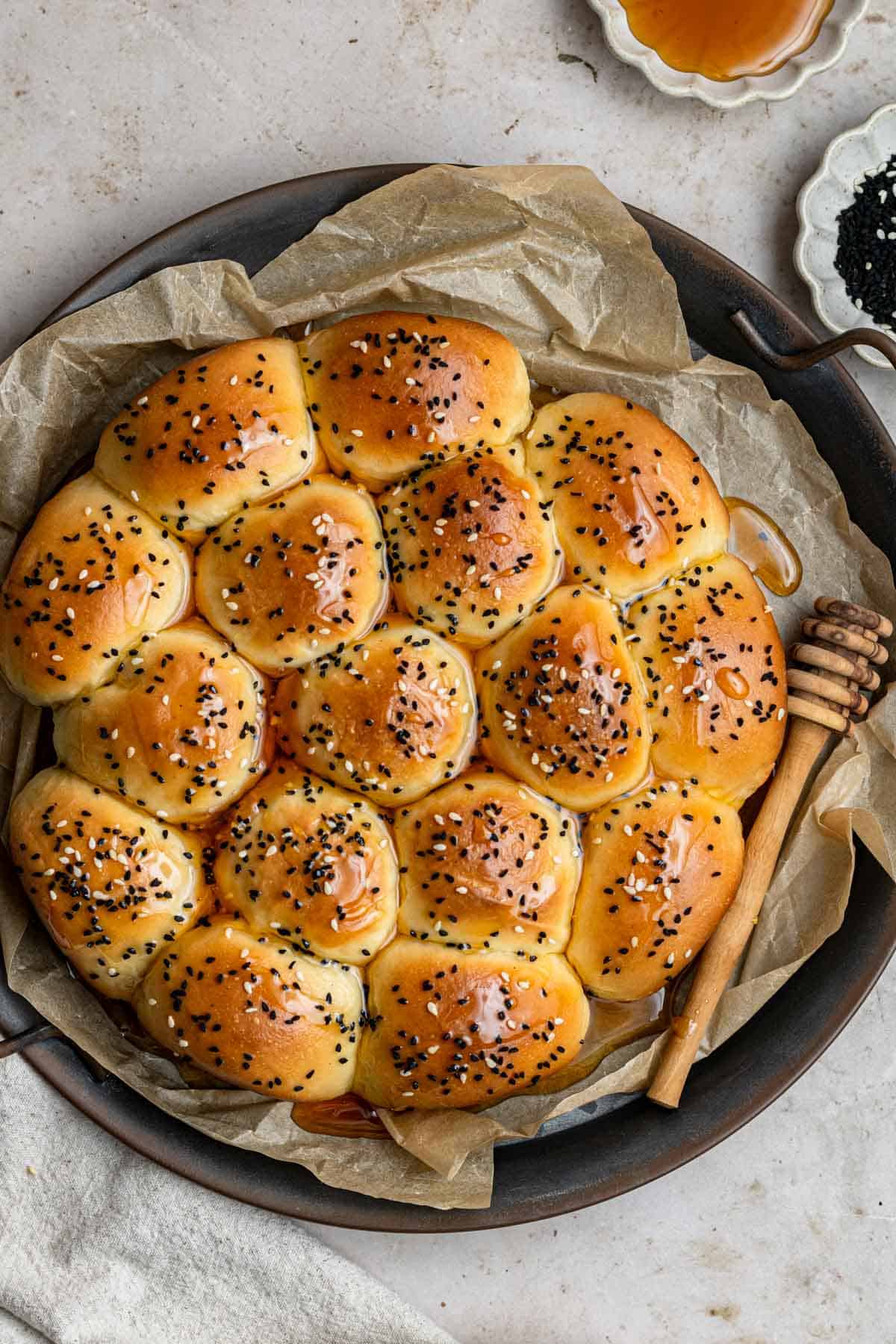 This Yemeni Honeycomb Bread (Khaliat al Nahl) is soft, fluffy, and filled with cream cheese, then topped with sesame seeds and honey syrup. A step-by-step recipe perfect for brunch or dessert.